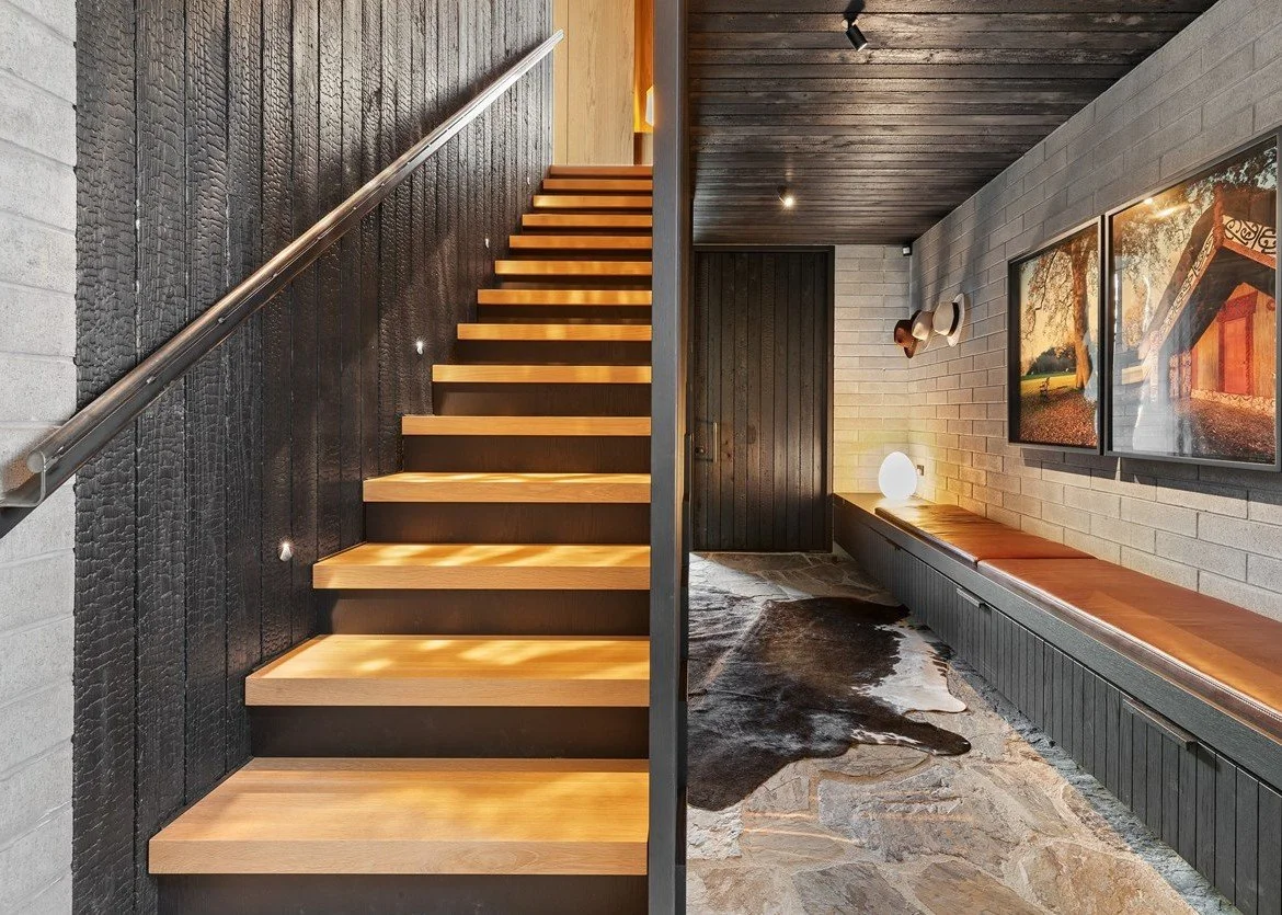 The abstract street-facing façade combines solid masonry with Japanese charred cedar and charred Siberian larch, providing privacy, texture, and a durable response to the local climate. Chartek’s charred timber adds depth and longevity to the exterior while supporting the home’s environmental performance.